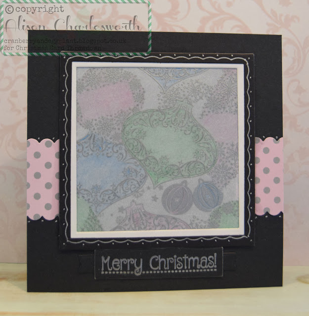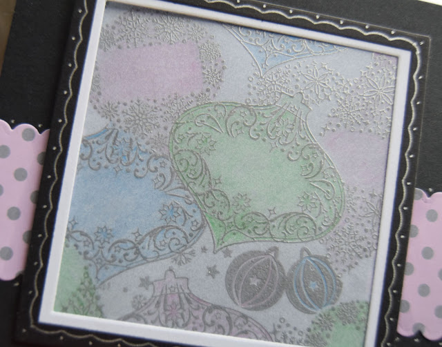 I started with a piece of white card and stamped and embossed the baubles in silver. (Still in a masking mood from a recent challenge).